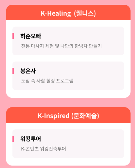 K-컬처를 직접 경험하는 관광에 초점이 맞춰져 있습니다.