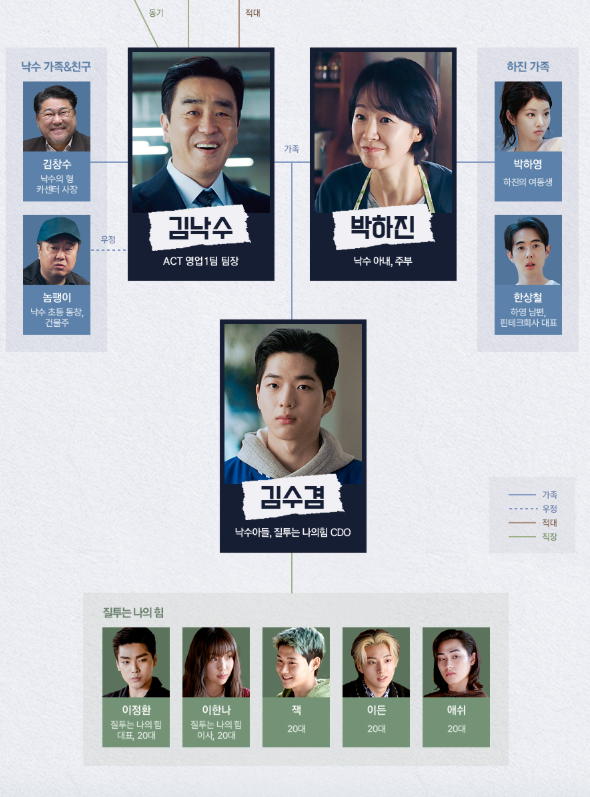 • 김낙수 부장 (류승룡) 입사 25년 차 대기업 영업팀장. 남들이 부러워하는 조건을 다 가졌지만, 점점 잃어가는 자신감과 존재감에 흔들리는 인물입니다. “성공한 삶”의 껍데기 뒤에서 진짜 자신을 찾아가는 여정을 그립니다.