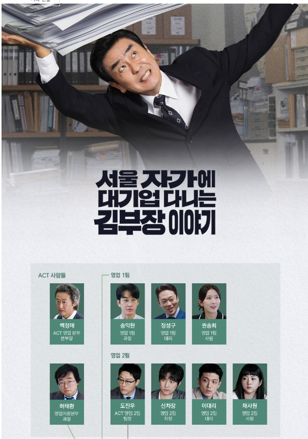 • 정은채 (오리지널 캐릭터) 드라마에서 새롭게 추가된 인물로, 김 부장의 삶에 새로운 변화를 일으키는 역할을 합니다.