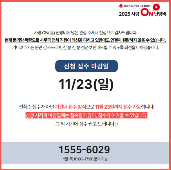 신청 완료 후에는 문자 또는 이메일로 접수 확인이 발송되며, 선정 결과는 개별 통보됩니다. 문의사항이 있는 경우 ‘사랑ON 난방비 사무국(1555-6029)’으로 연락하면 상세 안내를 받을 수 있습니다.