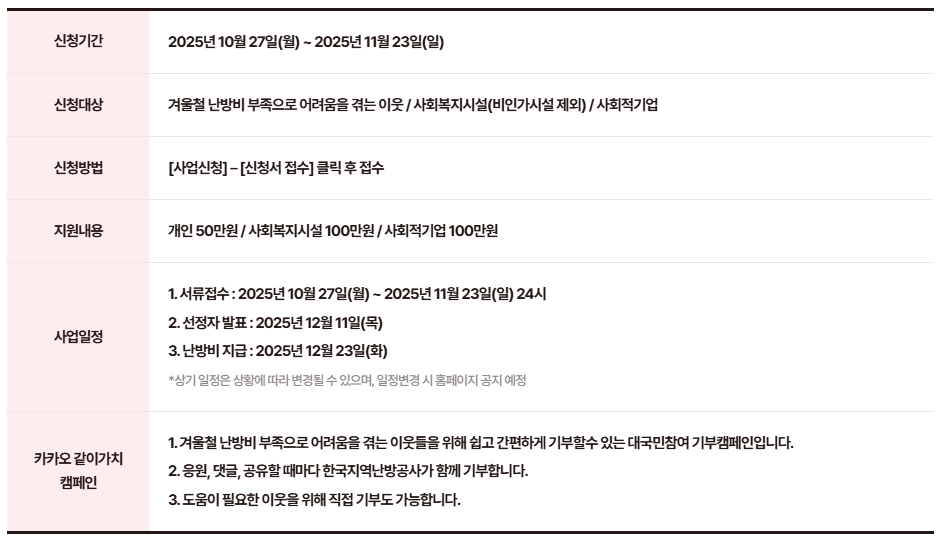 한국지역난방공사에서 에너지 취약계층을 대상으로 **최대 50만 원(단체 100만 원)**의 난방비를 지원합니다.