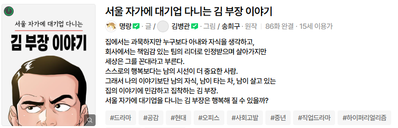 《서울 자가에 대기업 다니는 김 부장 이야기》는 송희구 작가가 집필한 소설로 시작된 작품입니다. 제목부터 눈길을 끄는 이 작품은 ‘서울 자가’, ‘대기업’, ‘부장’이라는 세 가지 키워드를 통해 대한민국 직장인들의 이상과 현실을 상징적으로 담고 있습니다.